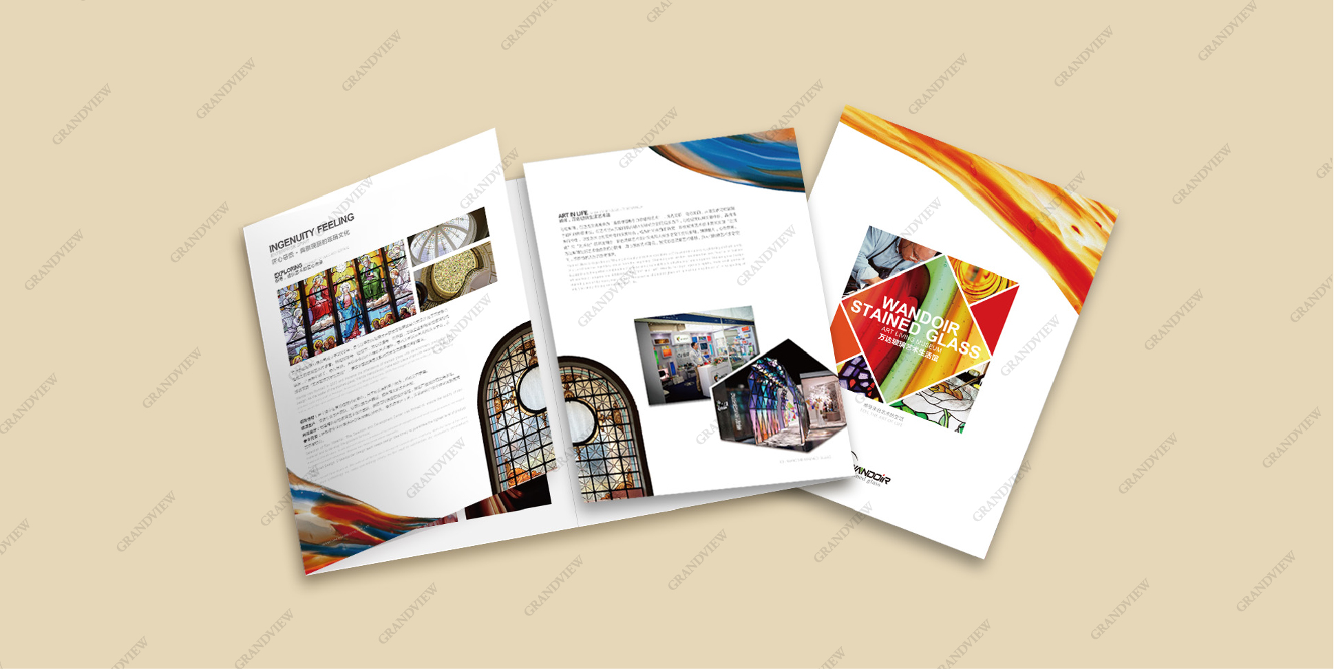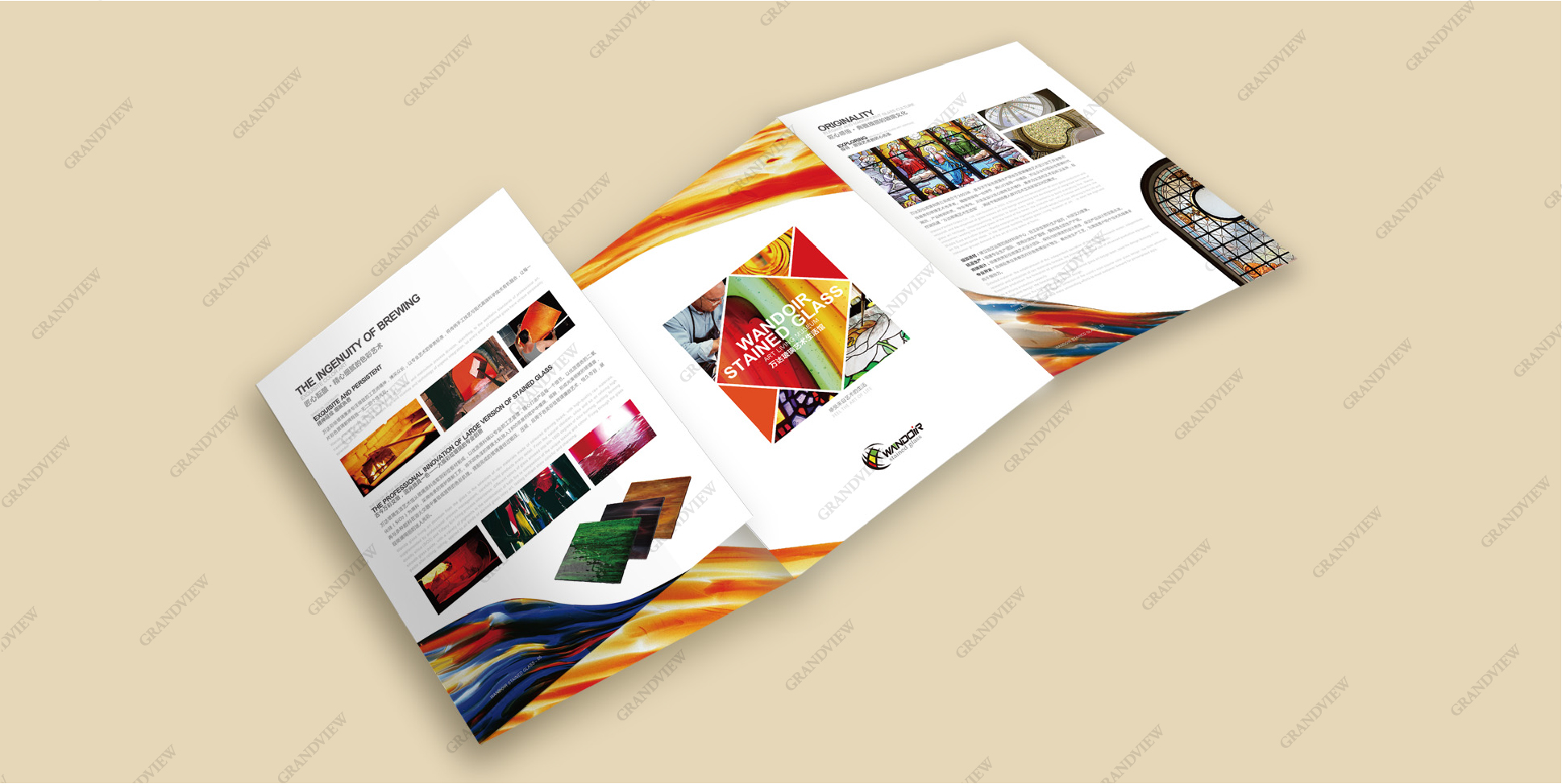 廣角為萬達萬達彩繪玻璃設計的折頁流光溢彩、絢麗燦爛,將“最具視覺吸引力結構藝術”的孤傲彩繪玻璃展品融入現實生活,賦予生活個性,賦予產品活力。折頁采用大紅、明黃、深綠等厚重的色彩設計,集藝術性和實用性于一體,充分展示了彩繪玻璃的獨特風格,將彩色玻璃藝術設計文化與人類生活空間交織相融,使其更具魅力。