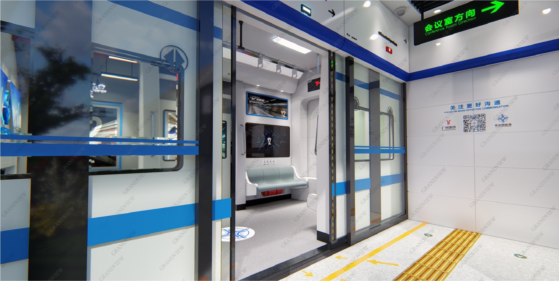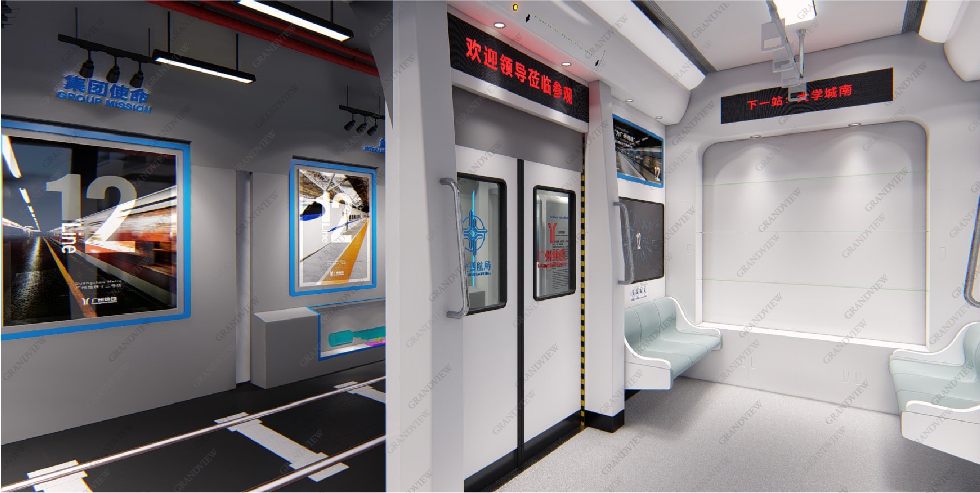 室外走廊、指示牌、盲道、自動門、站臺、軌道、隧洞等地鐵元素生動還原地鐵車廂形象,十分契合地鐵主題,可升降數(shù)字沙盤、不規(guī)則線條布局、仿太空艙VI體驗區(qū)盡顯高端科技的非凡魅力。廣角為廣州地鐵十號線傾心制作的展廳極具創(chuàng)意,讓人眼前一亮。